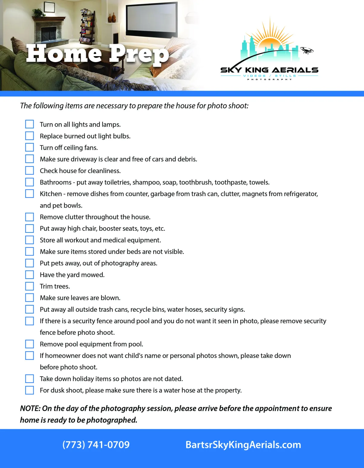 After setting an appointment with Bart Sr Sky King Aerials, please review the home preparation flyer to ensure your property is ready for the photo shoot. Here you will see all those requirements for photography